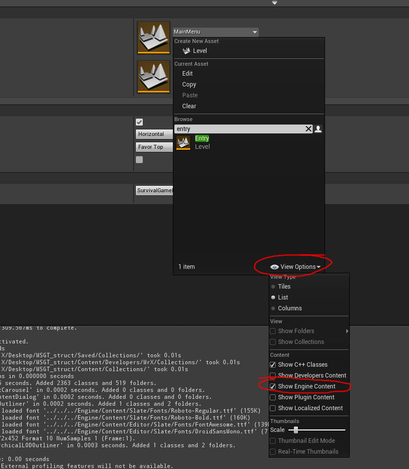 First of all, open your "Project Settings" and select the "Entry" map as the "Editor Startup Map", you need to click "View Options" at the bottom and select "Show Engine Content" for the Entry map to show up. This is so the engine loads up without any references to anything other than the engine core.