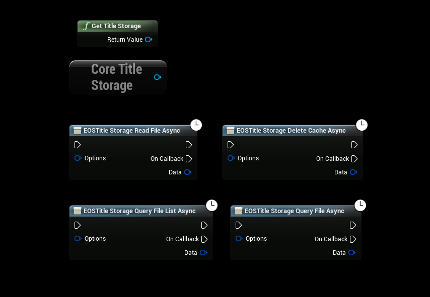 The Title Storage Interface enables developers using Epic Online Services (EOS) to retrieve encrypted data from cloud servers. Data that you store through this interface is accessible to any user on any device where they can log in. While similar to the Player Data Storage Interface, this interface is specialized to handle game-specific data rather than user-specific data, and can provide different versions of files based on the user's platform, region, or other conditions.