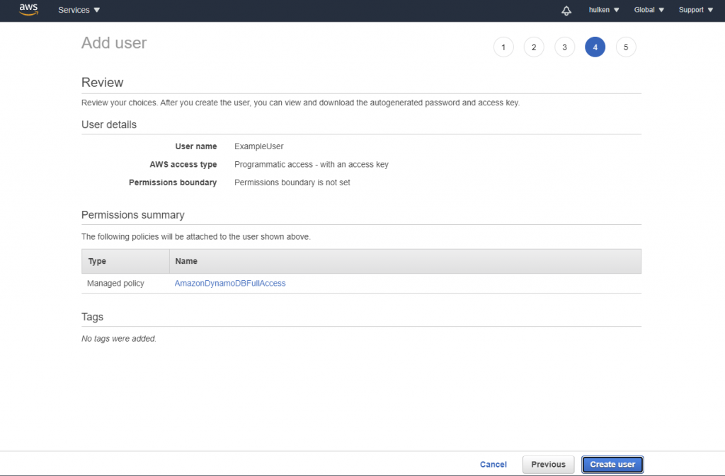 On the next screen click on “Attach existing policies directly†and search for DynamoDBFullAccess