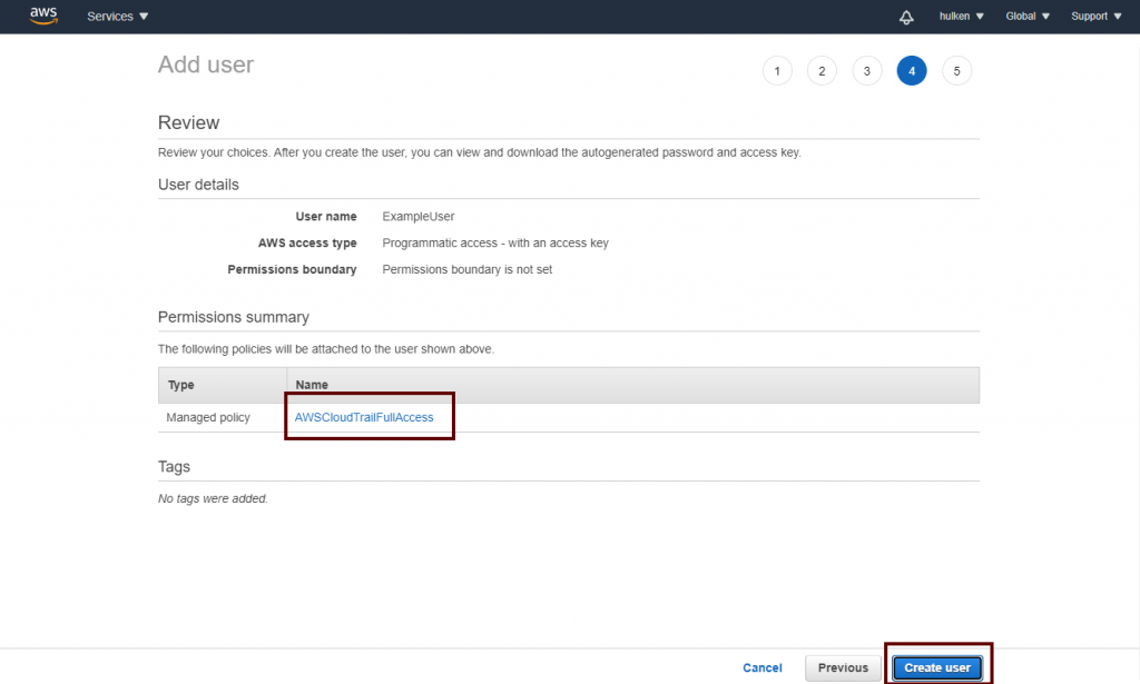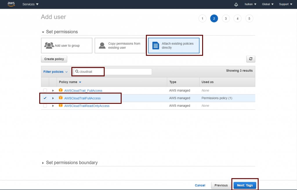 On the next screen click on “Attach existing policies directly†and search for "CloudTrail" and select “CloudTrailFullAccess“.