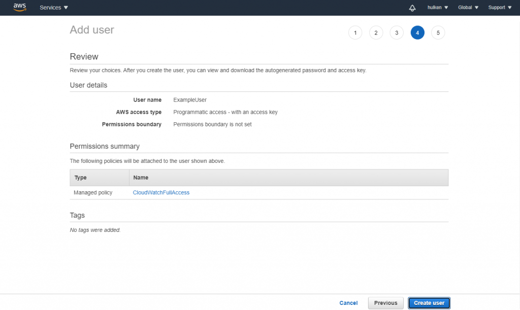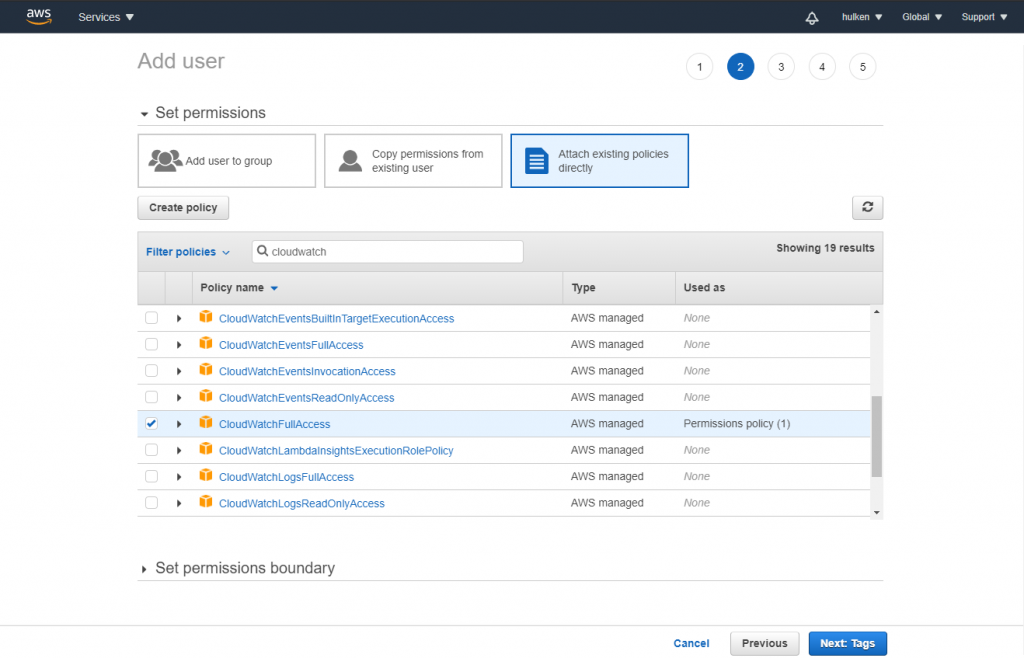 On the next screen click on “Attach existing policies directly” and search for "CloudWatch" and select “CloudWatchFullAccess“.