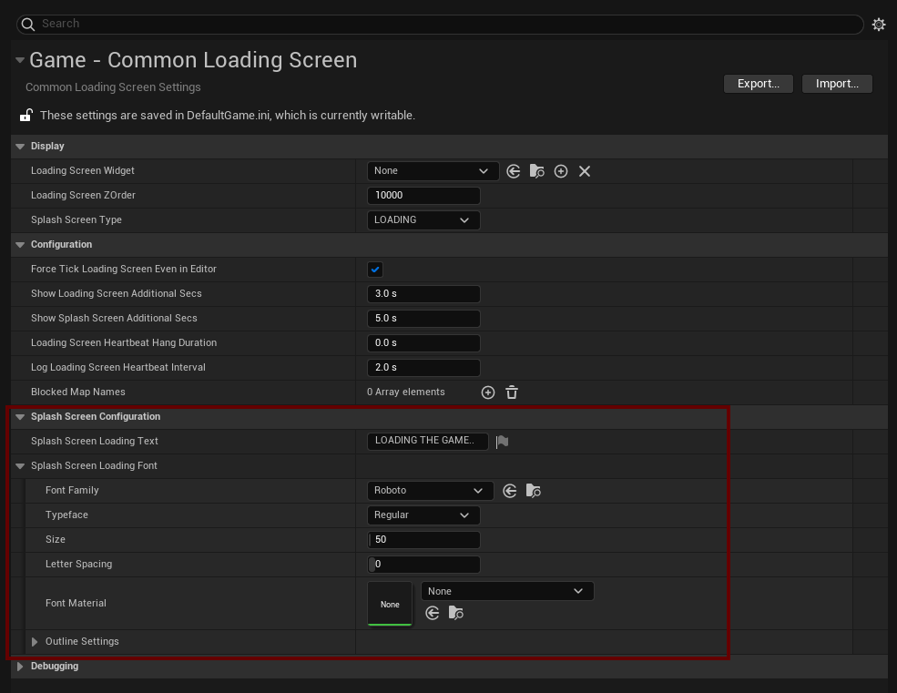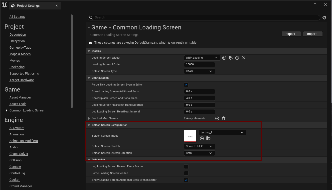 [/Script/CommonLoadingScreen.CommonLoadingScreenSettings] CommonLoadingScreen.ShowLoadingScreenAdditionalSecs=3.000000 LogLoadingScreenHeartbeatInterval=2.000000 SplashScreenImage=/Game/testing_1.testing_1