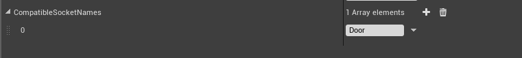Add a new socket to the CompatibleSocketNames array, here you determine what sockets that this building component can be placed on, in this example, Door is our compatible socket name, every building that has the socket "Door" we will be able to snap our new building to.