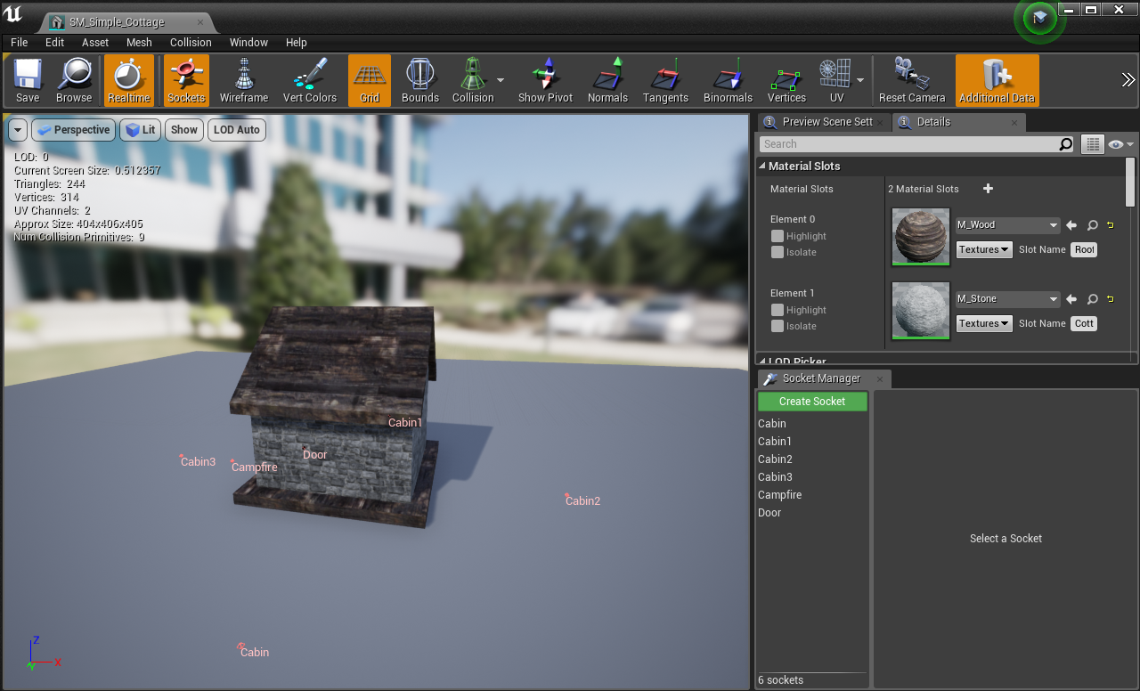 Inside /BuildingSystem/Meshes, open up any mesh that require a "Door" (can be anything), in this example, we'll use "SM_Simple_Cottage"